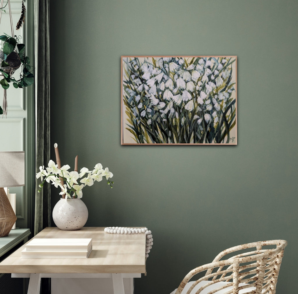 Delicate snowdrops emerge through cool winter tones in this impressionistic botanical work. Soft muted greens create a calm, contemplative atmosphere, while luminous white blooms suggest quiet renewal and resilience. A refined, tranquil painting that brings a gentle sense of light and stillness to contemporary interiors.